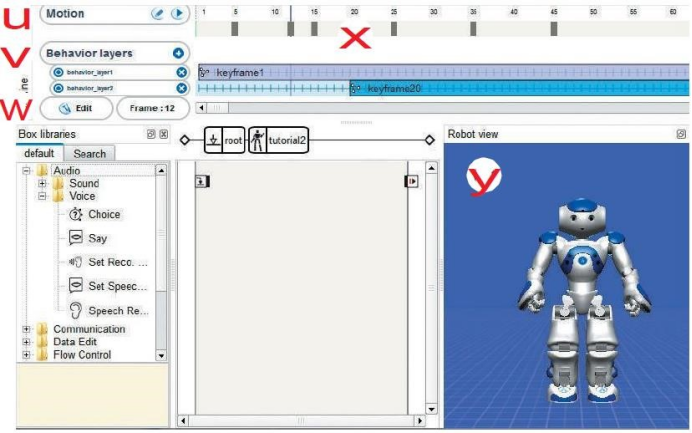基于关键帧的编程方法的本质是在某个时间点保存机器人当前状态下各关节所处的坐标。可以分为对整个身体,仅头,仅手臂,仅腿进行保存,时间线上的每个小格代表一毫秒(在默认中框架率FPS为10)。两个保存的帧之间的时间差代表从这个动作到下一个动作所用的时间,如果时间间隔过小,而动作较为剧烈的话,很可能会影响机器人的稳定性,甚至使机器人跌倒。
