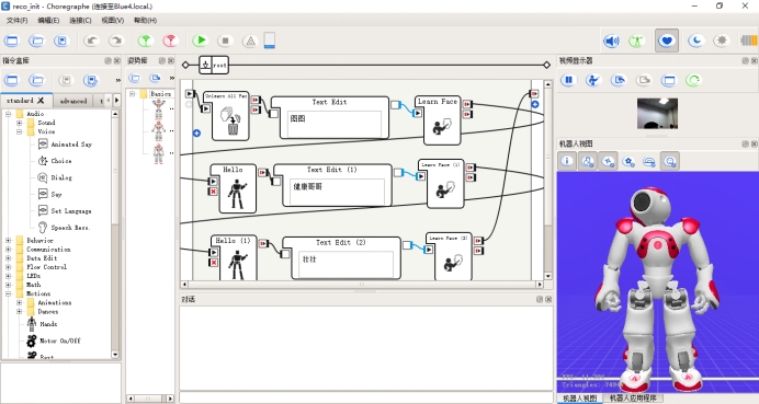 Nao机器人的人脸识别方法主要依赖于Face_Reco脸部记录指令完成。该指令使用摄像头和数据库中的脸部数据来辨识脸部。脸部记录指令盒可以辨认出每张脸属于谁(如果数据库中有的话)。当脸部辨识成功,第二个输出端会输出脸的名字。当有数张脸被辨识出来,数据库中记录的名字会依序输出。