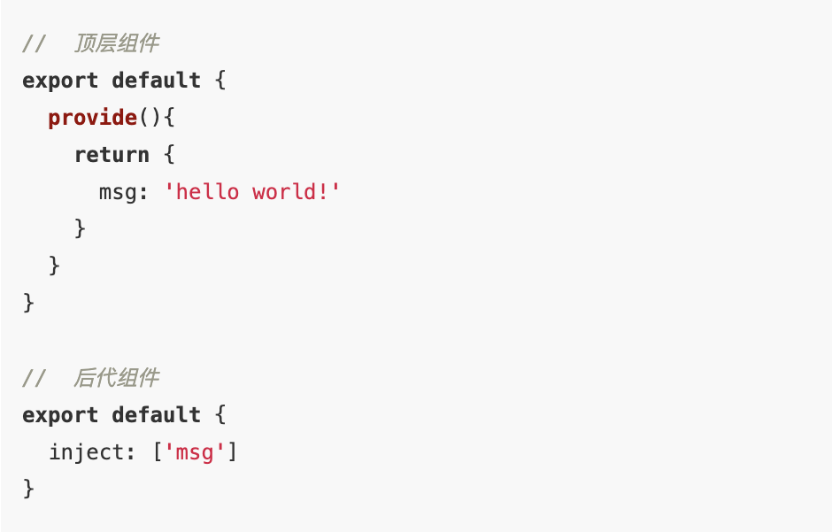 缺陷:传递的数据不是响应式的,inject接收到数据后,provide中的数据改变,但是后代组件中的数据不会改变。所以 建议传一些常量或者方法。
