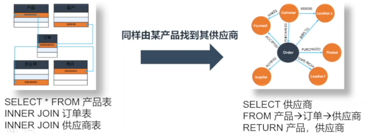 关系数据库:两步表关联;图数据库:给出一条路径即可
