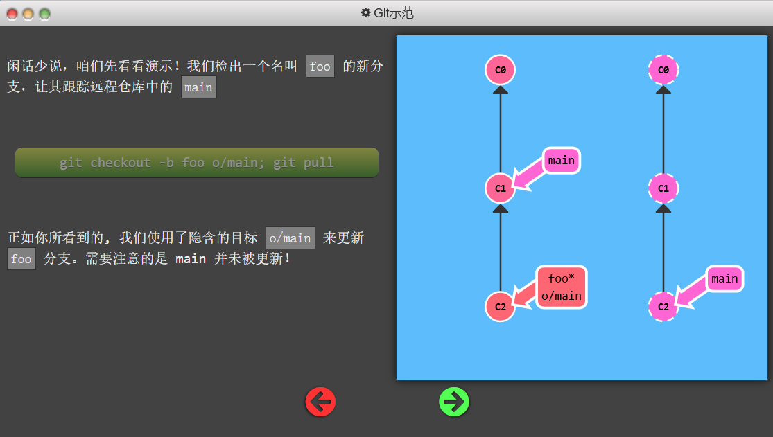 o/main——两种方法git checkout -b totallyNotMain o/main,新建分支让他追踪远程main分支git checkout -b foo o/main; git pull:foo分支和远程main分支一致,而原来的main分支没变