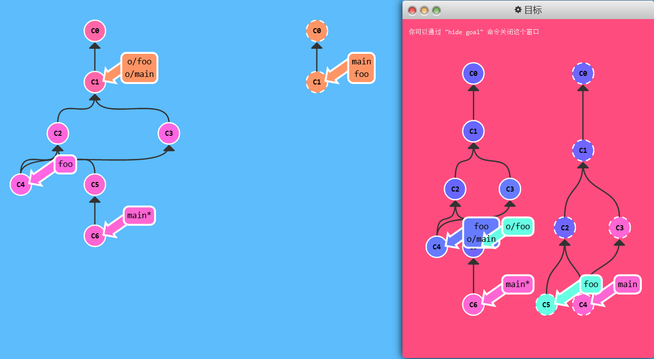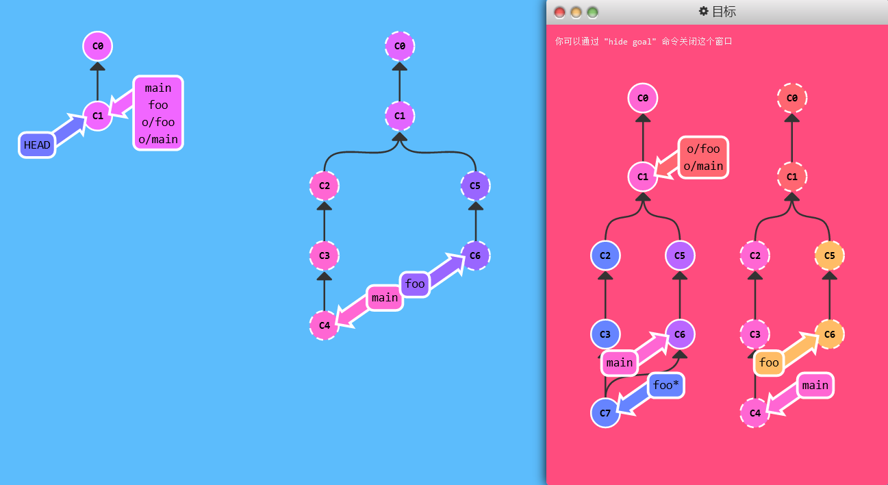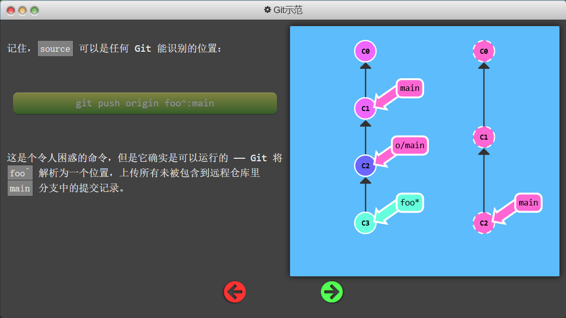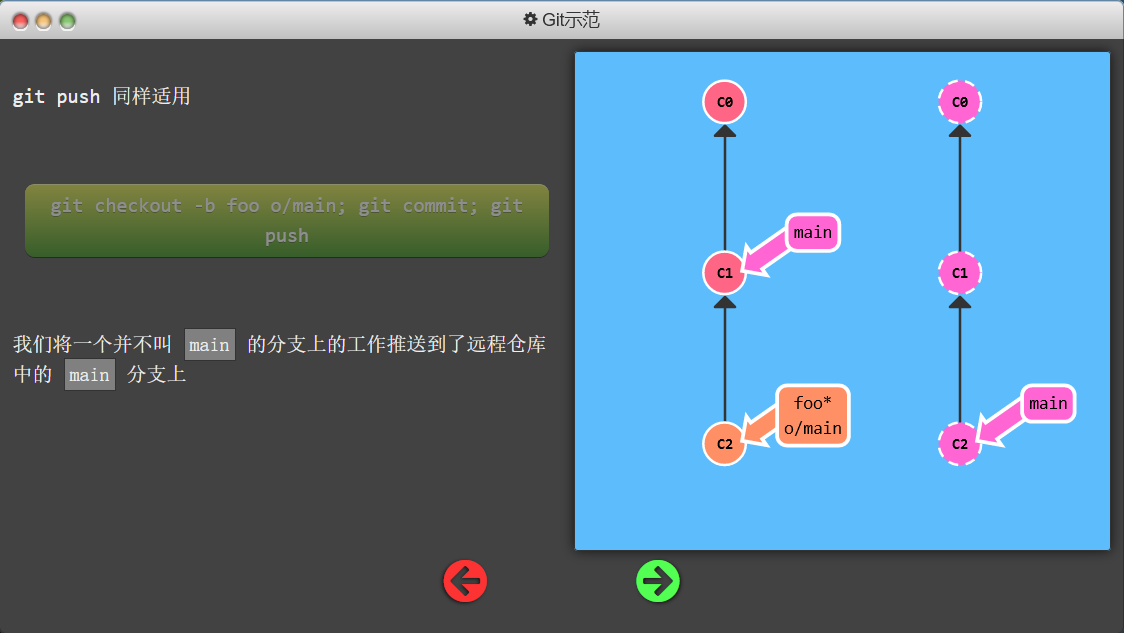 git checkout -b foo o/main; git commit; git push:本地提交的foo分支被push到了远程的main