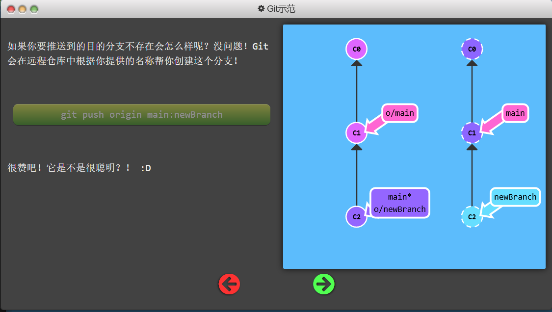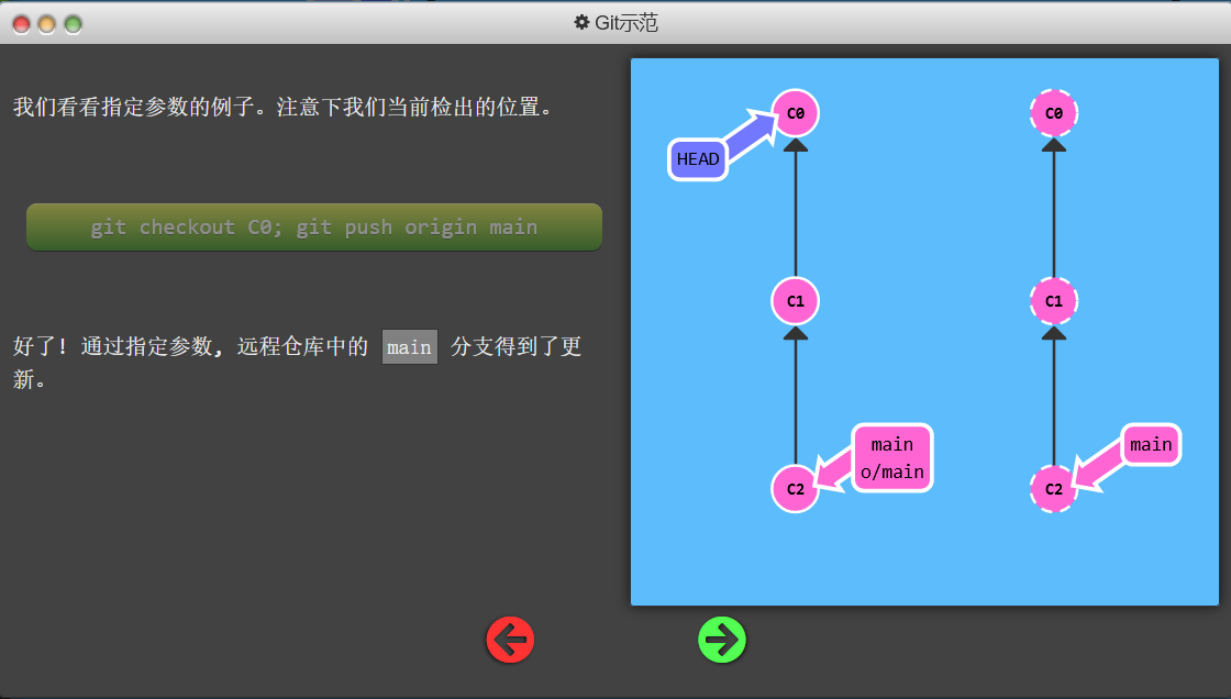 git push origin main切到本地仓库中的“main”分支,获取所有的提交,再到远程仓库“origin”中找到“main”分支,将远程仓库中没有的提交记录都添加上去,搞定之后告诉我。 - 因为我们通过指定参数告诉了 Git 所有它需要的信息, 所以它就忽略了我们所检出的分支的属性