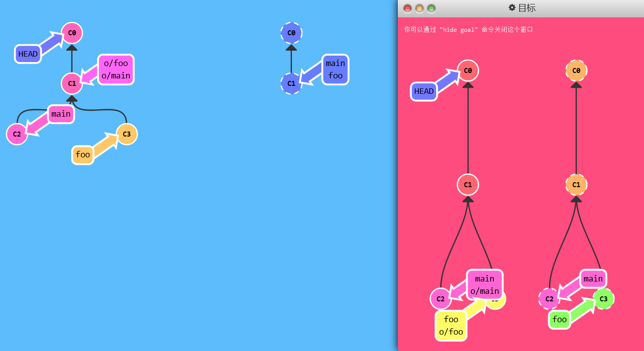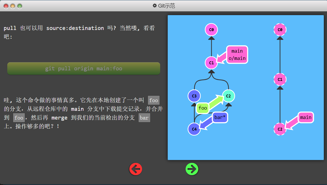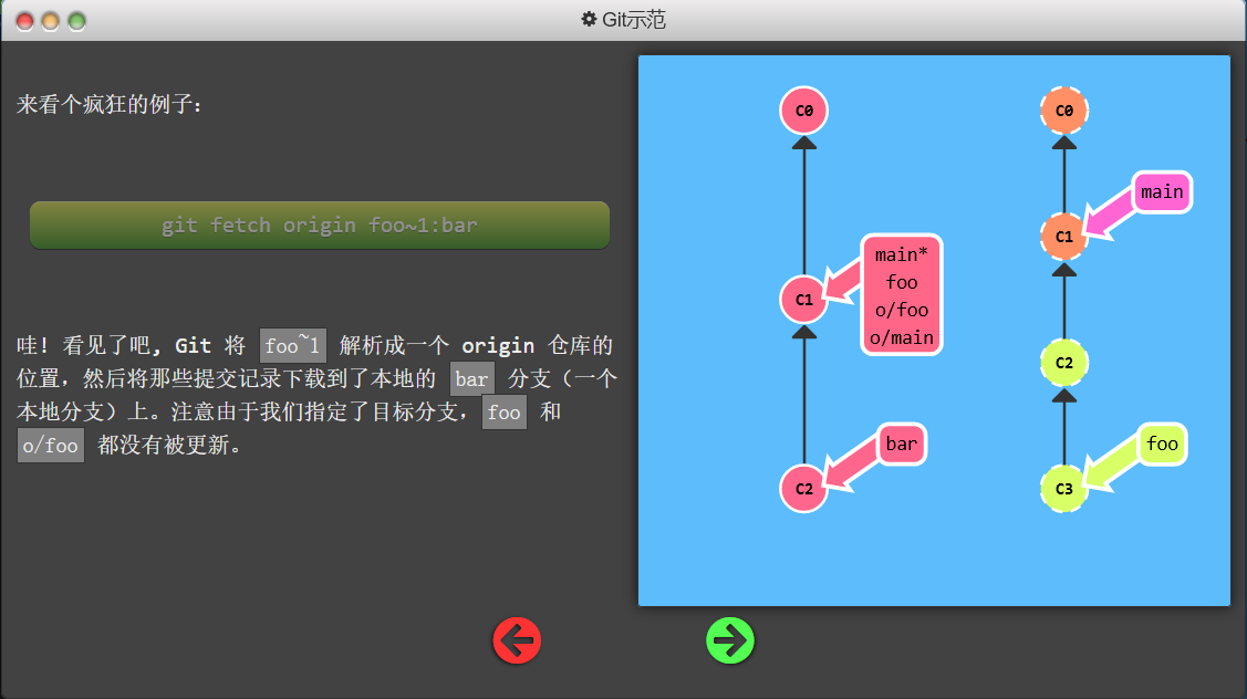 foo分支上,然后获取所有本地不存在的提交,放到本地的o/foo上。 - 因为fetch不会更改本地分支,所以本地foo分支没有同步