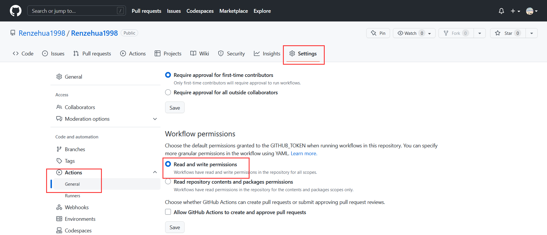 admin:repo_hook、repo和workflow权限 - 在和自己用户名同名的仓库里面设置允许Action操作仓库