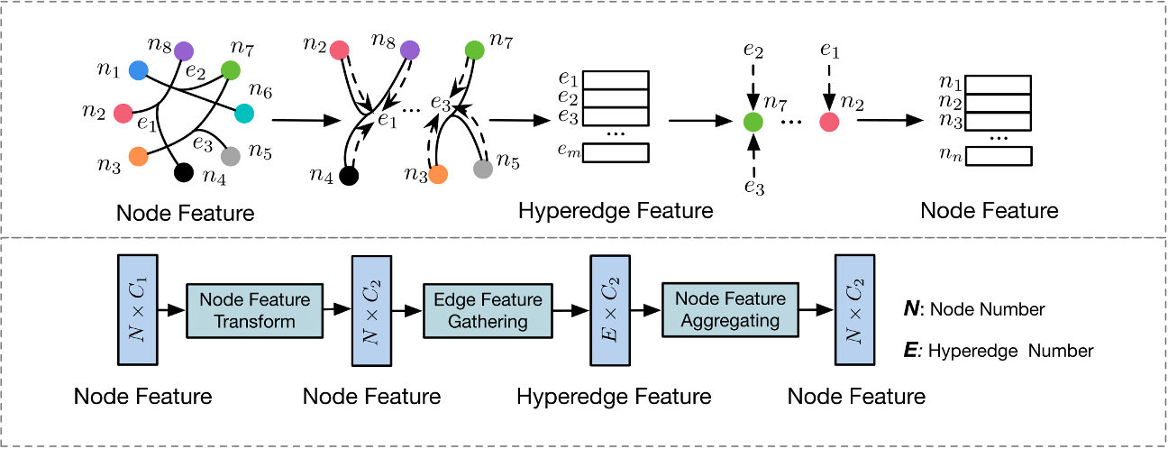 HGNN模型基于超图上的谱卷积。HGNN 层可以执行 节点-边-节点 的变换,这可以有效地提取超图上的高阶相关性。