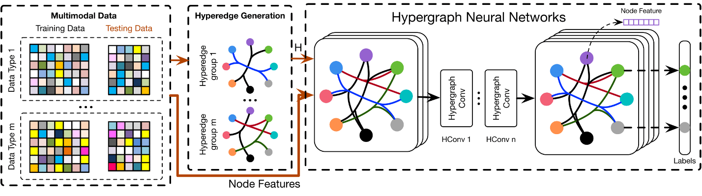 多模态数据集分为训练数据和测试数据,每个数据包含多个具有特征的节点。然后从多模态数据集的复杂相关性构建多个超边结构组。我们组合超边组以生成超图邻接矩阵